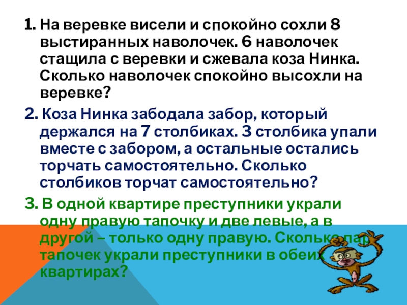 Слайд 161. На веревке висели и спокойно сохли 8 выстиранных наволочек. 6