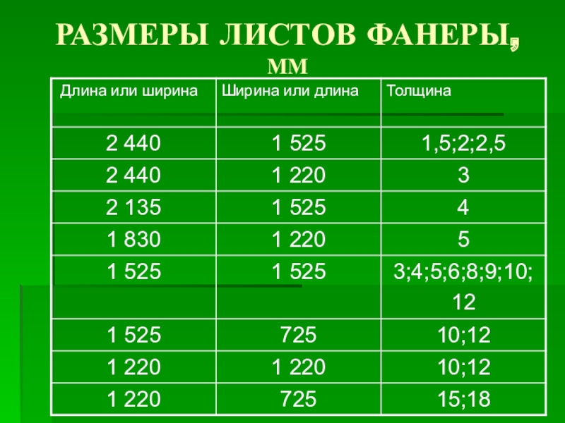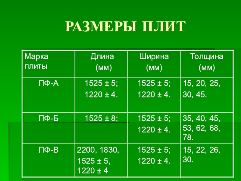 1220 х 2440мм 1220 х 3050мм 1250 х 2500мм при толщине плит 9…22мм