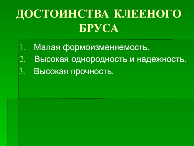 Слайд 28ДОСТОИНСТВА КЛЕЕНОГО БРУСА