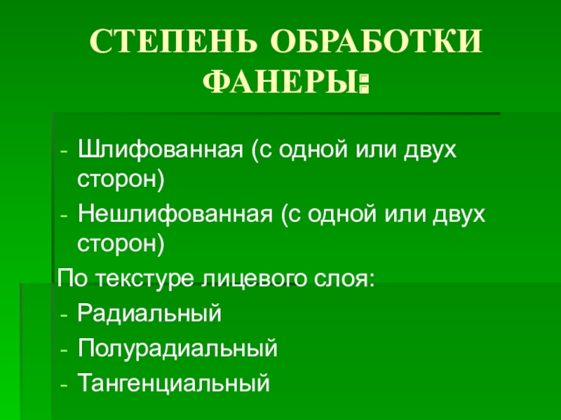 Слайд 31СТЕПЕНЬ ОБРАБОТКИ ФАНЕРЫ: