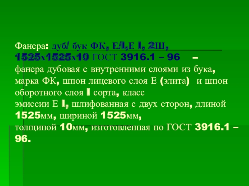 Слайд 21Фанера: дуб/ бук ФК, Е/I,Е I, 2Ш, 1525х1525х10 ГОСТ 3916.1 –