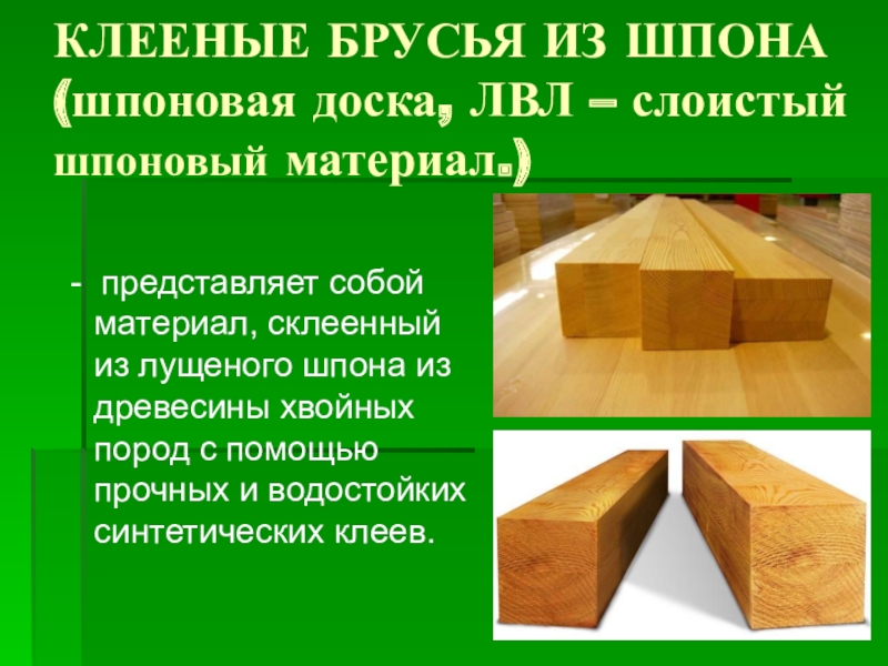 Слайд 26КЛЕЕНЫЕ БРУСЬЯ ИЗ ШПОНА