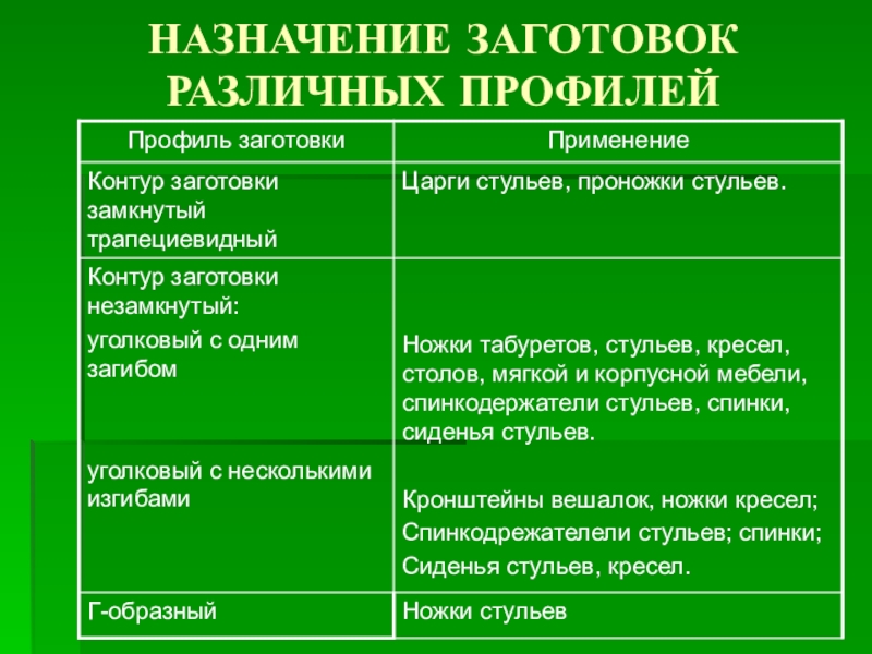 Слайд 39НАЗНАЧЕНИЕ ЗАГОТОВОК РАЗЛИЧНЫХ ПРОФИЛЕЙ