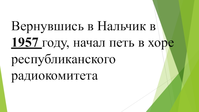 Слайд 6Вернувшись в Нальчик в 1957 году, начал петь в хоре республиканского