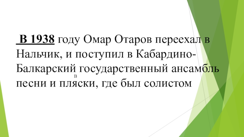 В В 1938 году Омар Отаров переехал в Нальчик, и поступил в Кабардино-Балкарский государственный ансамбль песни