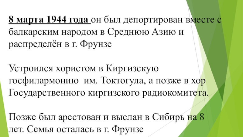Слайд 58 марта 1944 года он был депортирован вместе с балкарским народом