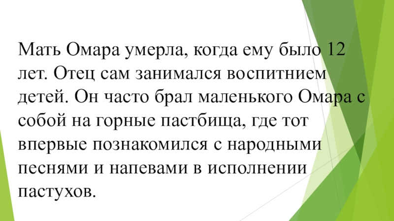 воспитнием детей. Он часто брал маленького Омара с собой на горные пастбища, где тот впервые познакомился с народными песнями и напевами в исполнении пастухов.
