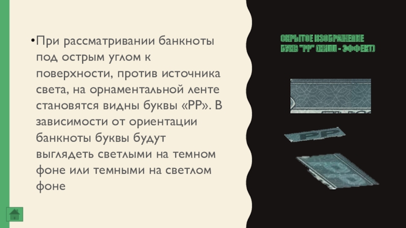 углом к поверхности, против источника света, на орнаментальной ленте становятся видны буквы «РР». В зависимости от ориентации банкноты буквы будут выглядеть светлыми на темном фоне или темными на светлом фоне