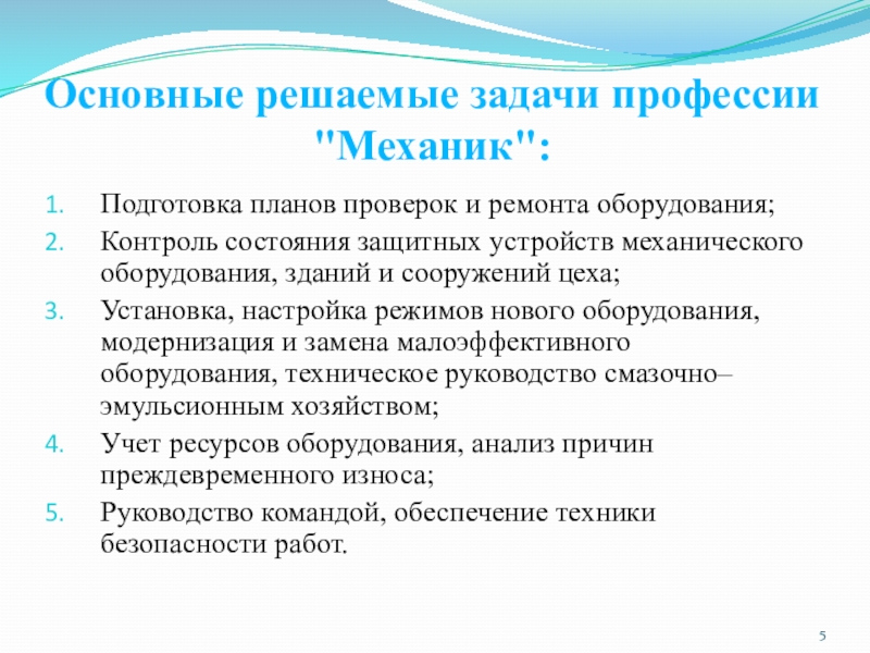 Слайд 5Основные решаемые задачи профессии "Механик":