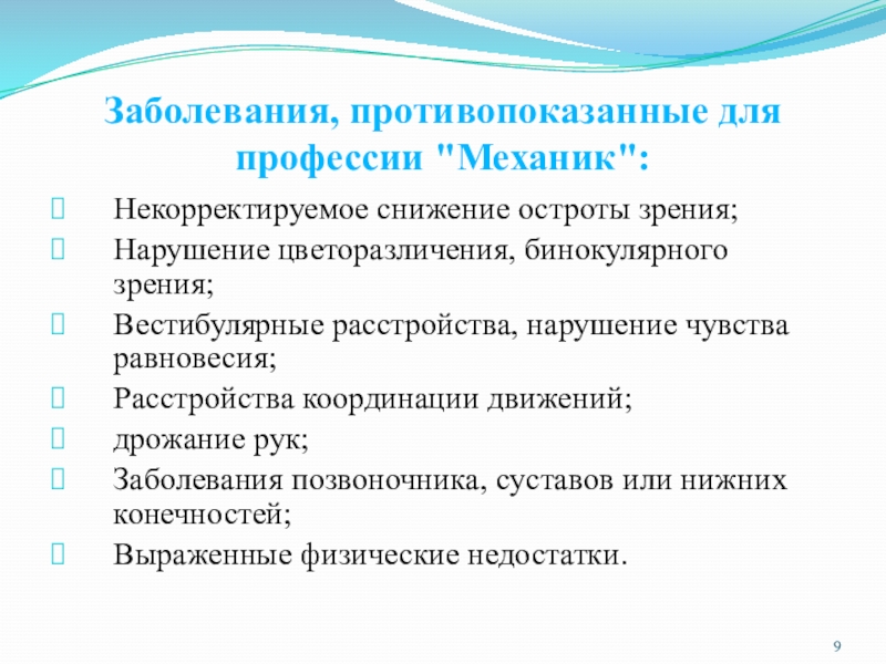 Слайд 9Заболевания, противопоказанные для профессии "Механик":