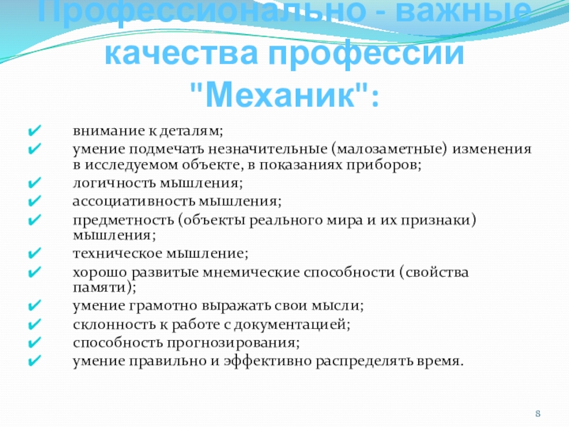 Слайд 8Профессионально - важные качества профессии "Механик":