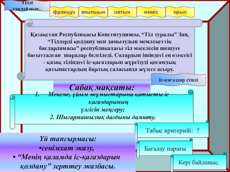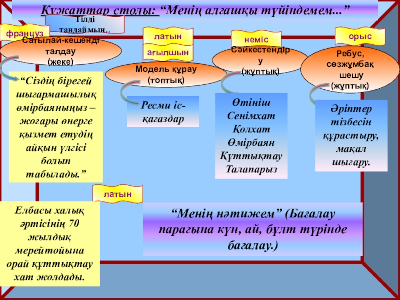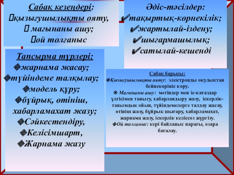 Көрнекіліктер: актив тақта кітапханасы, бейнежазбалар, электронды оқулық, парақтар, постер беттері