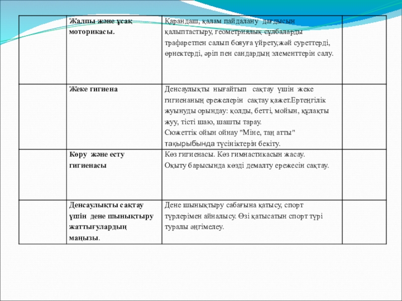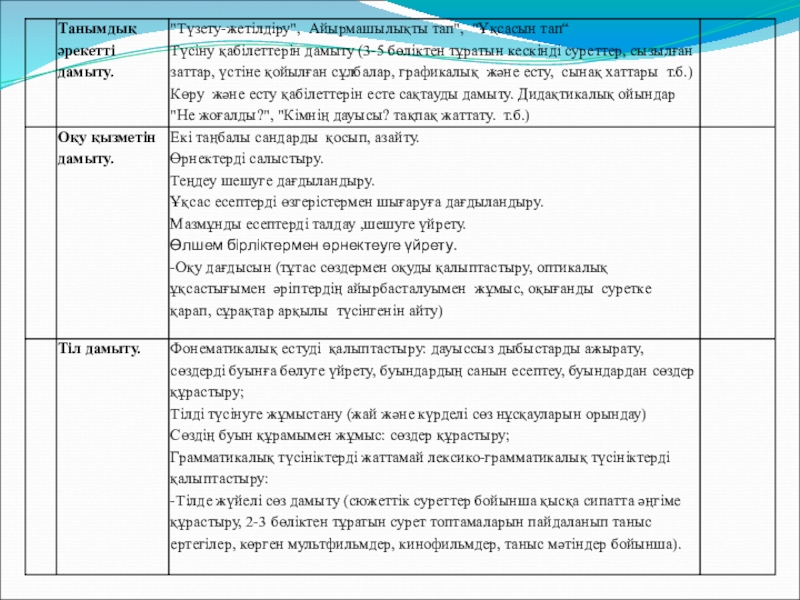 Түзете-дамыту: Сөйлеу тілін, зейінің, есте сақтауын, ұсақ моторикасын дамыту.