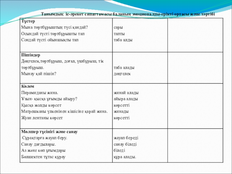 Слайд 9Танымдық іс-әрекет сипаттамасы баланың эмоционалды-ерікті ортасы және тәртібі