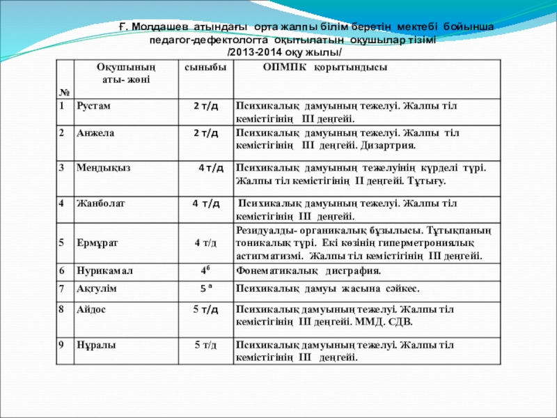 педагог-дефектологта оқытылатын оқушылар тізімі