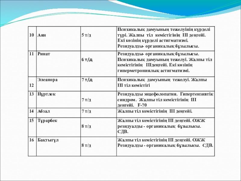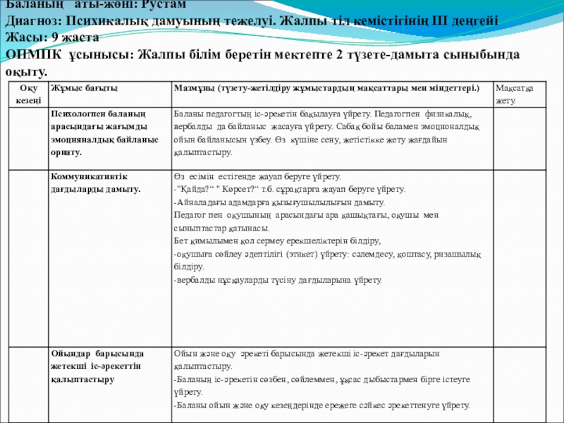 Диагноз: Психикалық дамуының тежелуі. Жалпы тіл кемістігінің ІІІ