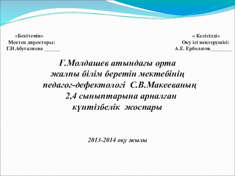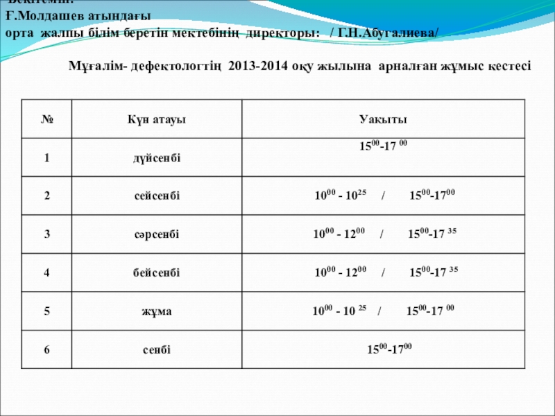 Мұғалім- дефектологтің 2013-2014 оқу жылына арналған жұмыс кестесі