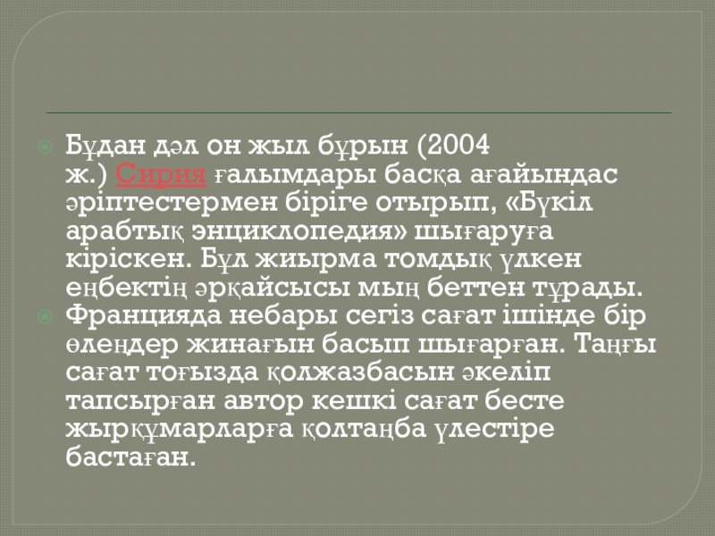 отырып, «Бүкіл арабтық энциклопедия» шығаруға кіріскен. Бұл жиырма томдық үлкен еңбектің әрқайсысы мың беттен тұрады.