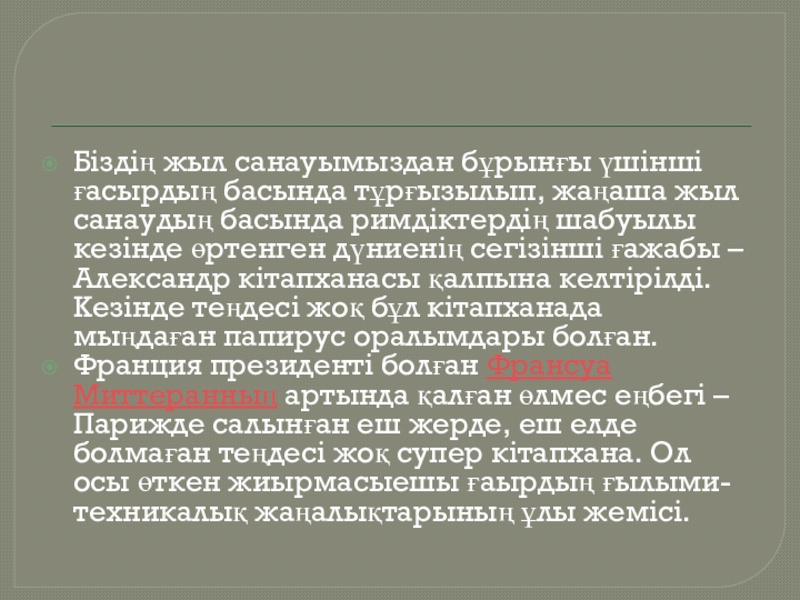 Франция президенті болған Франсуа Миттеранның артында қалған өлмес еңбегі – Парижде салынған еш жерде, еш елде болмаған теңдесі жоқ супер кітапхана. Ол осы өткен жиырмасыешы ғаырдың ғылыми-техникалық жаңалықтарының ұлы жемісі.