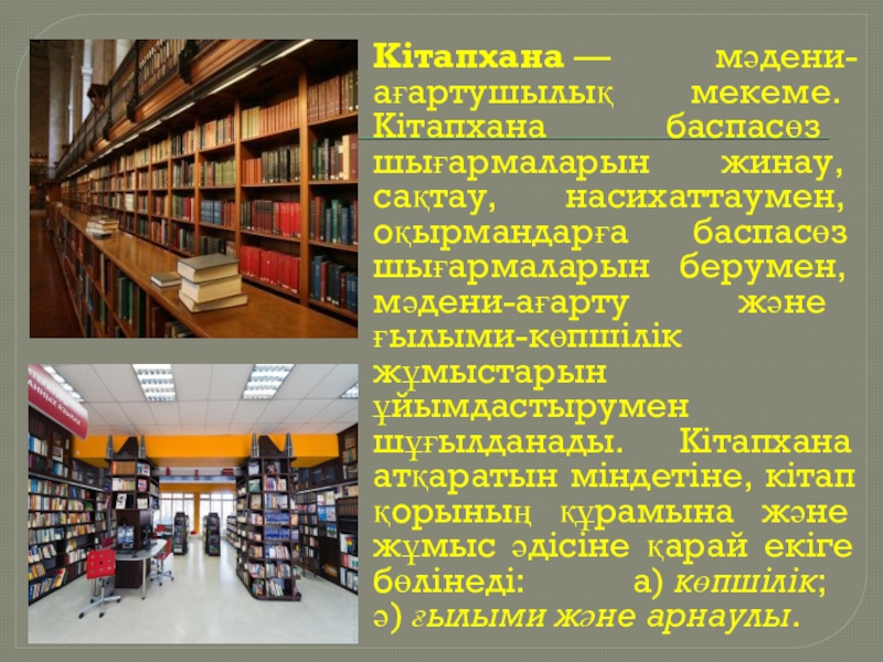Слайд 2Кітапхана — мәдени-ағартушылық мекеме. Кітапхана баспасөз шығармаларын жинау, сақтау, насихаттаумен, оқырмандарға баспасөз
