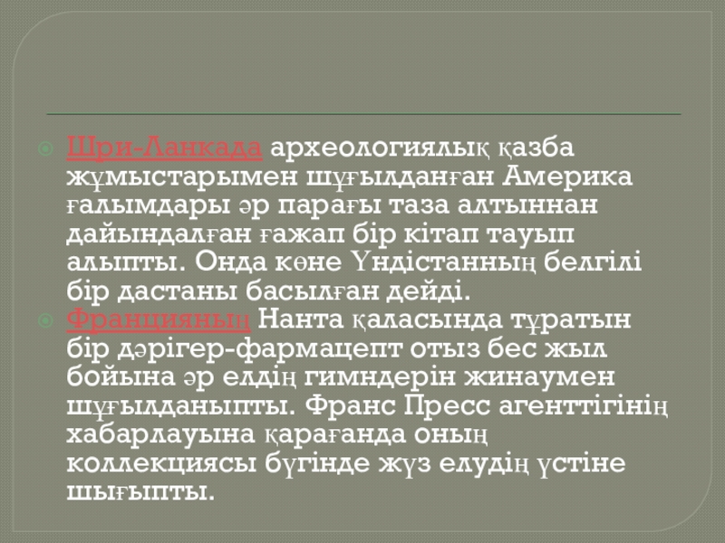 Слайд 6Шри-Ланкада археологиялық қазба жұмыстарымен шұғылданған Америка ғалымдары әр парағы таза алтыннан дайындалған