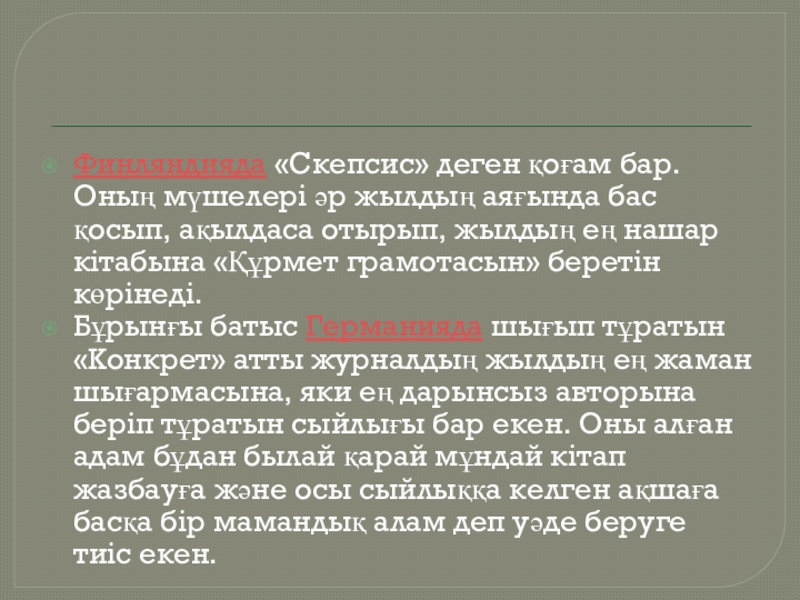 Слайд 5Финляндияда «Скепсис» деген қоғам бар. Оның мүшелері әр жылдың аяғында бас қосып,