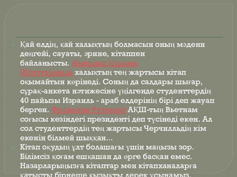 байланысты. Америка Құрама Штаттарында халықтың тең жартысы кітап оқымайтын көрінеді. Соның да салдары шығар, сұрақ-анкета нәтижесіне үңілгенде студенттердің 40 пайызы Израиль - араб елдерінің бірі деп жауап берген. Франклин Рузвельт АҚШ-тың Вьетнам соғысы кезіндегі президенті деп түсінеді екен. Ал сол студенттердің тең жартысы Черчилльдің кім екенін білмей шыққан...