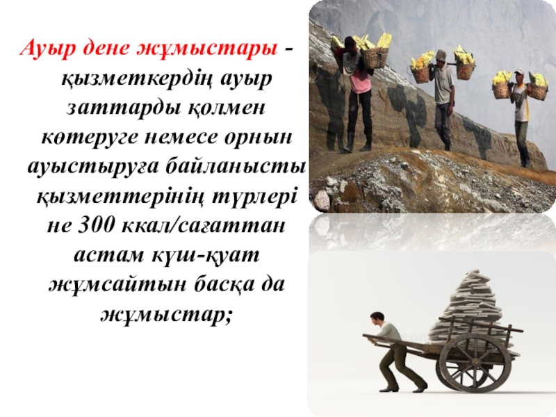 Слайд 7Ауыр дене жұмыстары - қызметкердiң ауыр заттарды қолмен көтеруге немесе орнын