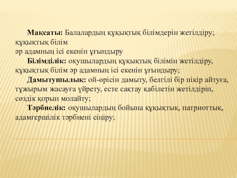 Слайд 2 Мақсаты: Балалардың құқықтық білімдерін жетілдіру;құқықтық білім  әр адамның ісі екенін ұғындыру Білімділік: оқушылардың