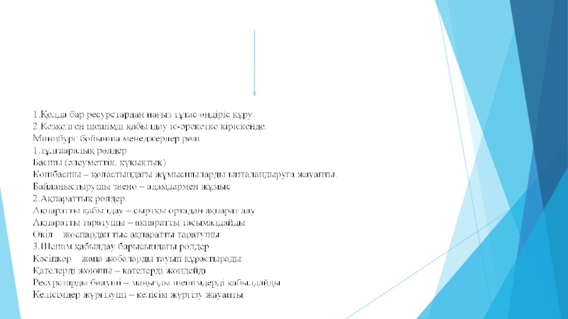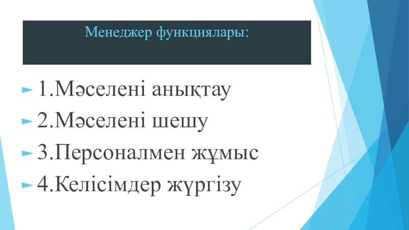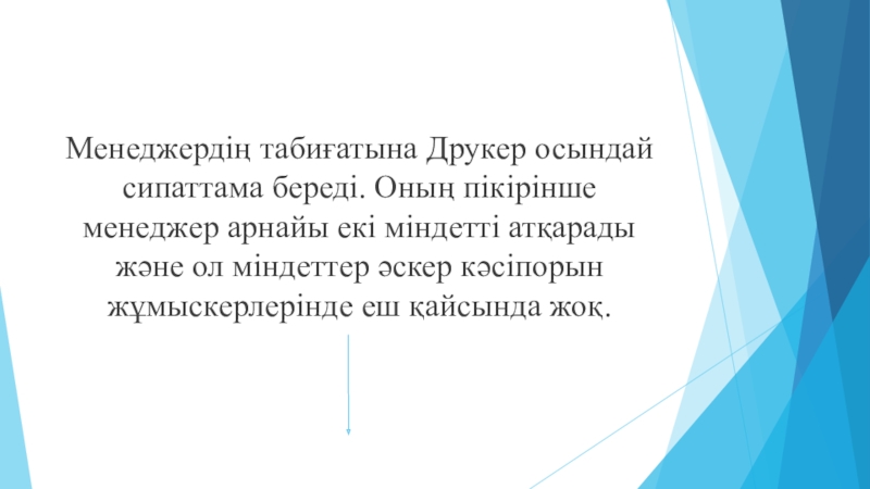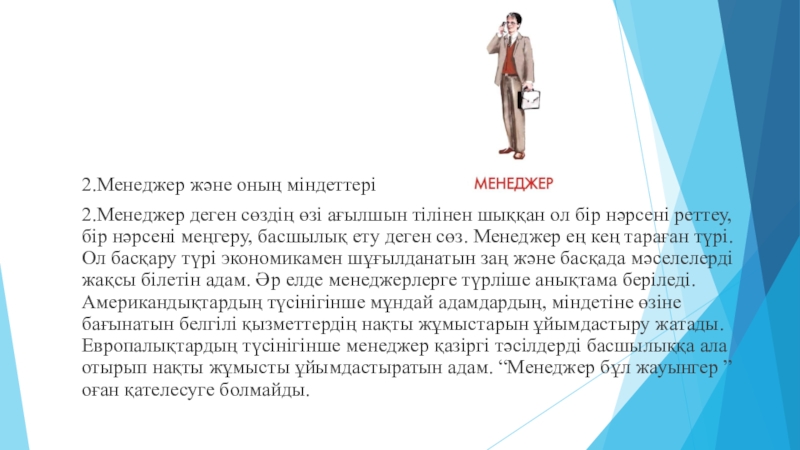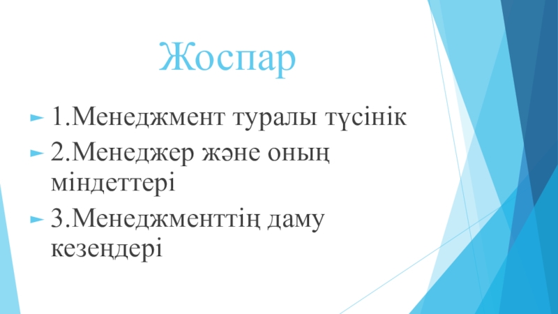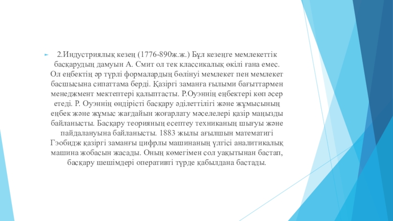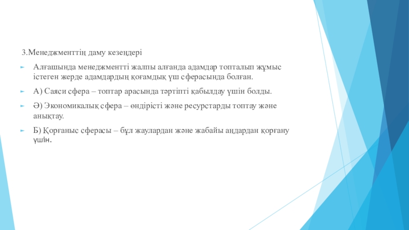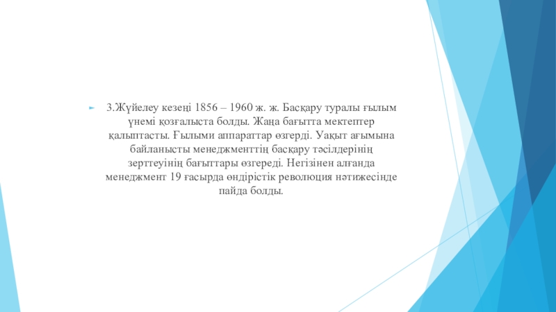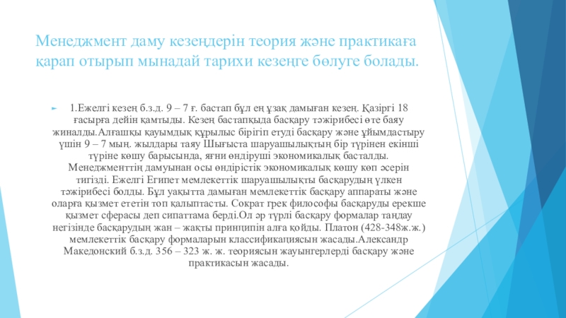 1.Ежелгі кезең б.з.д. 9 – 7 ғ. бастап бұл ең ұзақ дамыған кезең. Қазіргі 18 ғасырға дейін қамтыды. Кезең бастапқыда басқару тәжірибесі өте баяу жиналды.Алғашқы қауымдық құрылыс бірігіп етуді басқару және ұйымдастыру үшін 9 – 7 мың. жылдары таяу Шығыста шаруашылықтың бір түрінен екінші түріне көшу барысында, яғни өндіруші экономикалық басталды. Менеджменттің дамуынан осы өндірістік экономикалық көшу көп әсерін тигізді. Ежелгі Египет мемлекеттік шаруашылықты басқарудың үлкен тәжірибесі болды. Бұл уақытта дамыған мемлекеттік басқару аппараты және оларға қызмет ететін топ қалыптасты. Сократ грек философы басқаруды ерекше қызмет сферасы деп сипаттама берді.Ол әр түрлі басқару формалар таңдау негізінде басқарудың жан – жақты принципін алға қойды. Платон (428-348ж.ж.) мемлекеттік басқару формаларын классификациясын жасады.Александр Македонский б.з.д. 356 – 323 ж. ж. теориясын жауынгерлерді басқару және практикасын жасады.