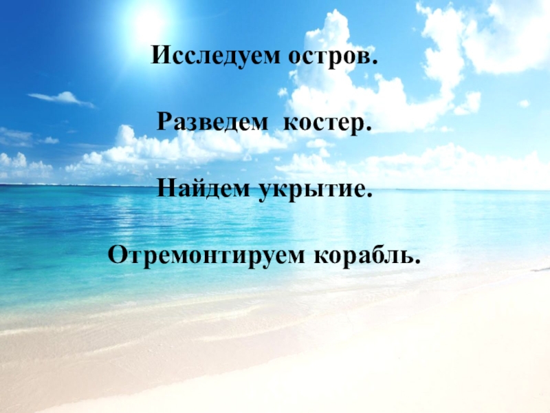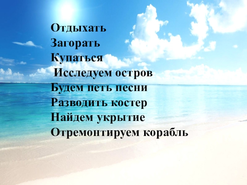 ОтдыхатьЗагорать Купаться Исследуем островБудем петь песниРазводить костерНайдем укрытиеОтремонтируем корабль