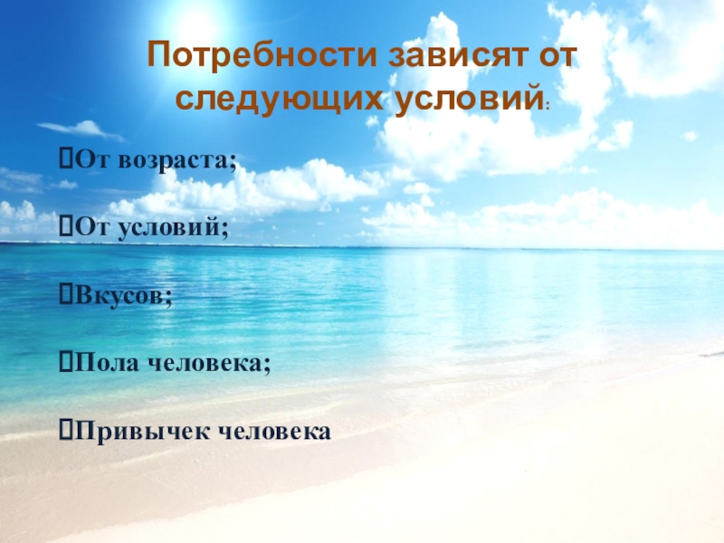 Потребности зависят от следующих условий:От возраста;От условий;Вкусов;Пола человека;Привычек человека