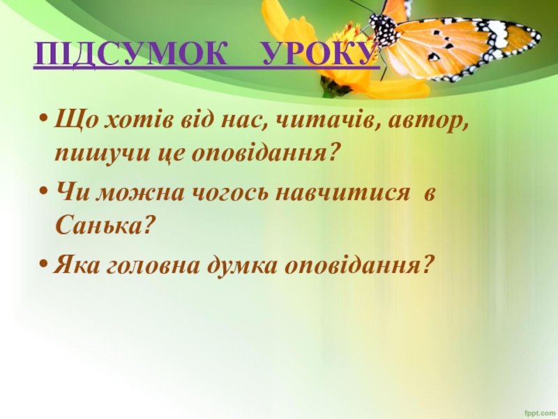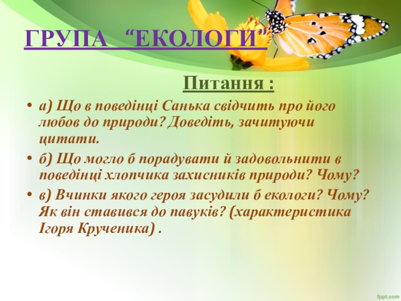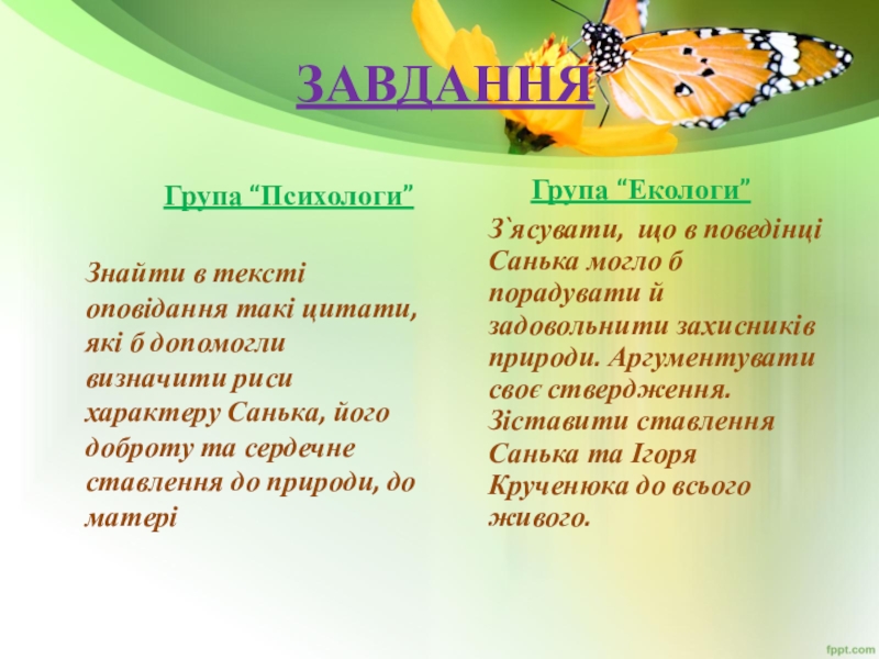 З`ясувати, що в поведінці Санька могло б порадувати й задовольнити захисників природи. Аргументувати своє ствердження. Зіставити ставлення Санька та Ігоря Крученюка до всього живого.