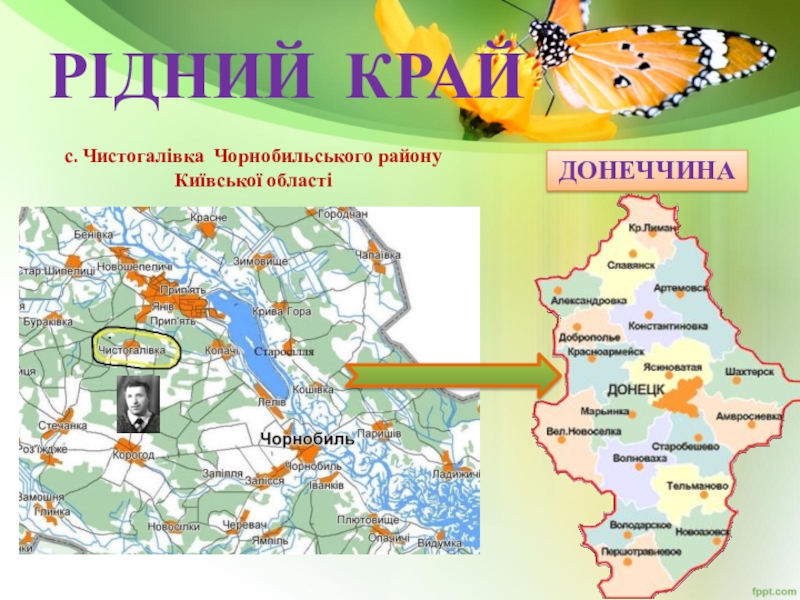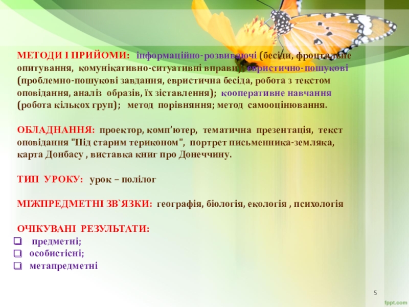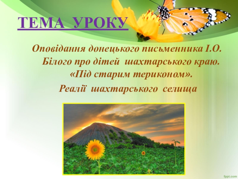 ОБЛАДНАННЯ: проектор, комп’ютер, тематична презентація, текст оповідання "Під старим териконом", портрет письменника-земляка, карта Донбасу , виставка книг про Донеччину.
