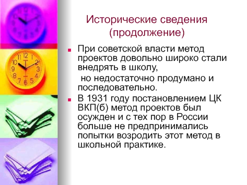 В 1931 году постановлением ЦК ВКП(б) метод проектов был осужден и с тех пор в России больше не предпринимались попытки возродить этот метод в школьной практике.