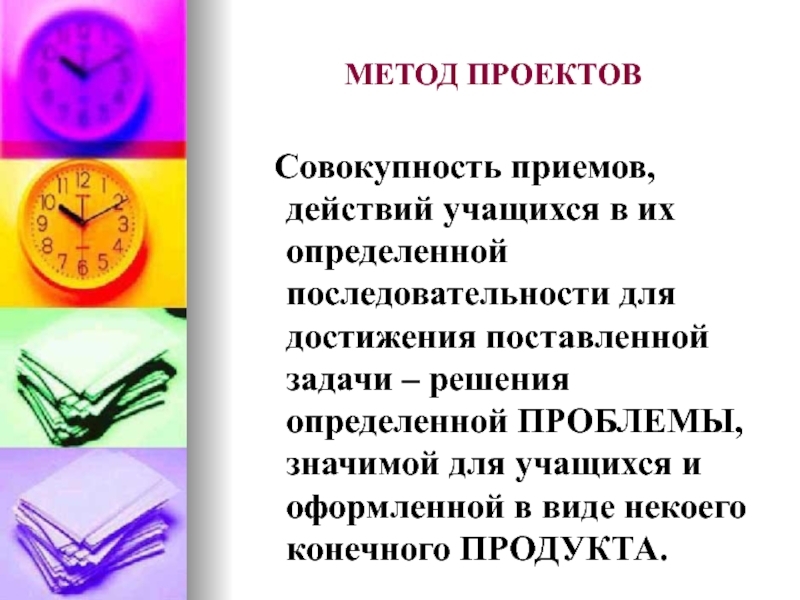 достижения поставленной задачи – решения определенной ПРОБЛЕМЫ, значимой для учащихся и оформленной в виде некоего конечного ПРОДУКТА.