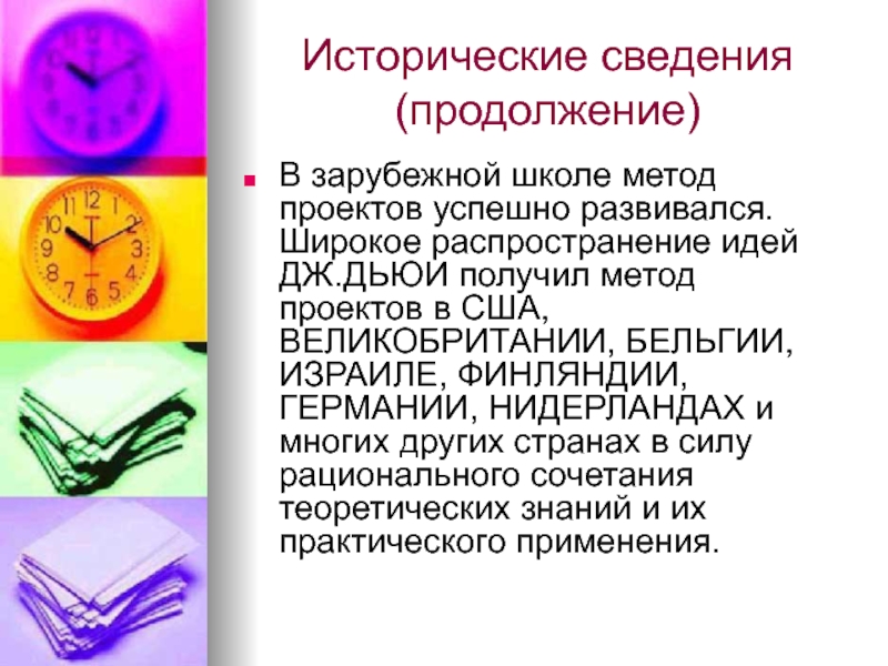 идей ДЖ.ДЬЮИ получил метод проектов в США, ВЕЛИКОБРИТАНИИ, БЕЛЬГИИ, ИЗРАИЛЕ, ФИНЛЯНДИИ, ГЕРМАНИИ, НИДЕРЛАНДАХ и многих других странах в силу рационального сочетания теоретических знаний и их практического применения.