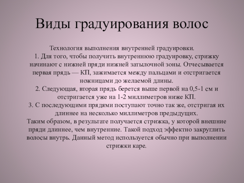 внутреннюю градуировку, стрижку начинают с нижней пряди нижней затылочной зоны. Отчесывается первая прядь — КП, зажимается между пальцами и отстригается ножницами до желаемой длины. 2. Следующая, вторая прядь берется выше первой на 0,5-1 см и отстригается уже на 1-2 миллиметров ниже КП. 3. С последующими прядями поступают точно так же, отстригая их длиннее на несколько миллиметров предыдущих. Таким образом, в результате получается стрижка, у которой внешние пряди длиннее, чем внутренние. Такой подход эффектно закруглить волосы внутрь. Данный метод используется обычно при выполнении стрижки каре.