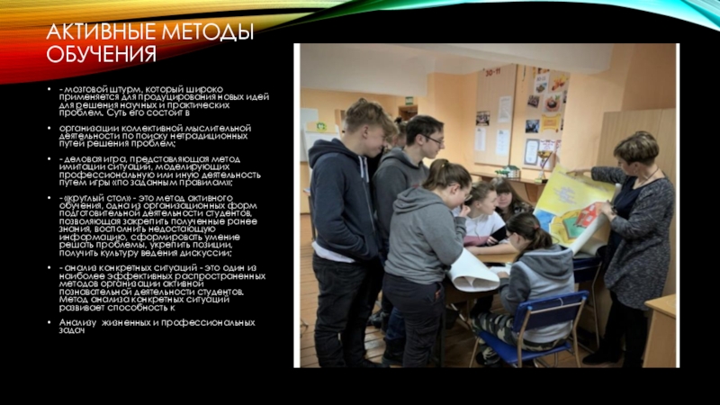 А для этого необходимы новые подходы и новые методы обучения, которые могли бы научить студента учиться, т.е. самостоятельно находить и усваивать нужную информацию. И как раз, здесь уместно сказать об активных методах обучения, которые позволяют создать условия для формирования и закрепления профессиональных знаний, умений и навыков у студентов.