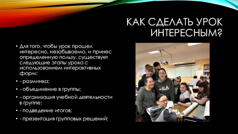 принес определенную пользу, существует следующие этапы урока с использованием интерактивных форм: