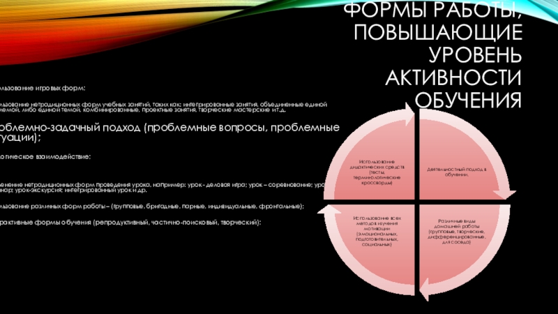 Слайд 11Формы работы, повышающие уровень активности обучения