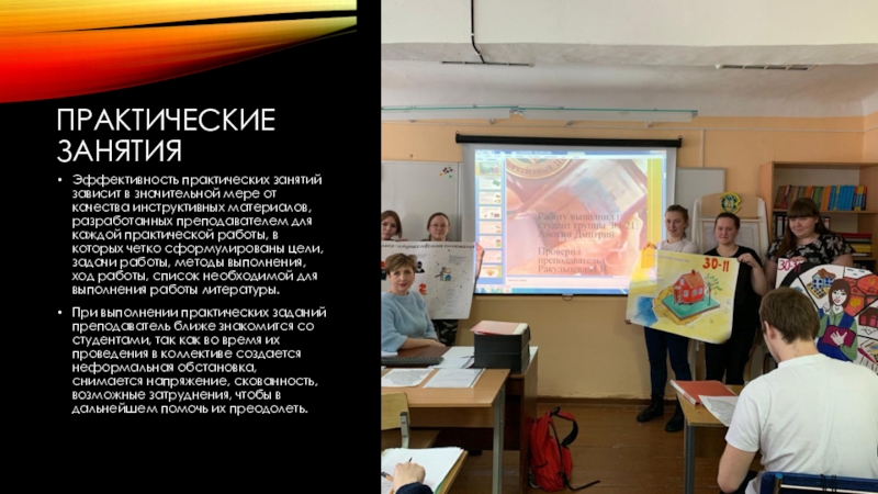 При выполнении практических заданий преподаватель ближе знакомится со студентами, так как во время их проведения в коллективе создается неформальная обстановка, снимается напряжение, скованность, возможные затруднения, чтобы в дальнейшем помочь их преодолеть.