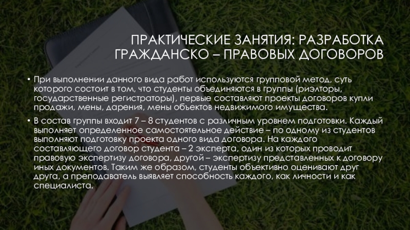 используются групповой метод, суть которого состоит в том, что студенты объединяются в группы (риэлторы, государственные регистраторы), первые составляют проекты договоров купли продажи, мены, дарения, мены объектов недвижимого имущества.
