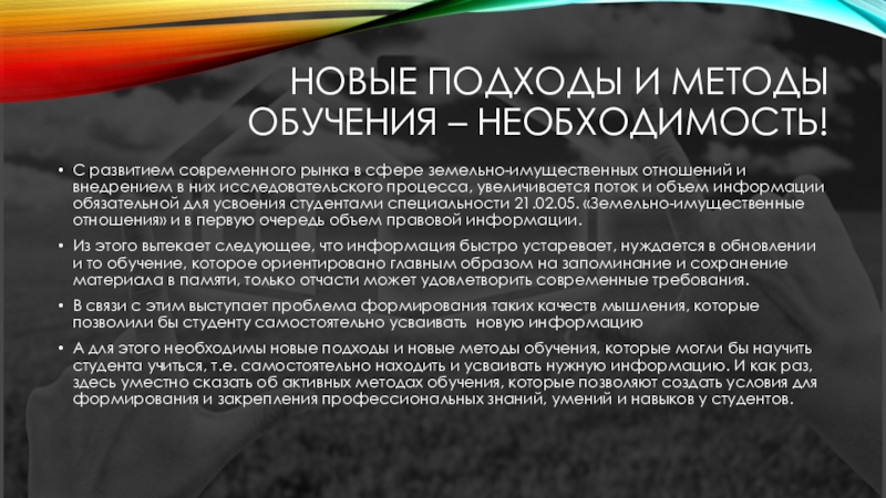 сфере земельно-имущественных отношений и внедрением в них исследовательского процесса, увеличивается поток и объем информации обязательной для усвоения студентами специальности 21.02.05. «Земельно-имущественные отношения» и в первую очередь объем правовой информации.