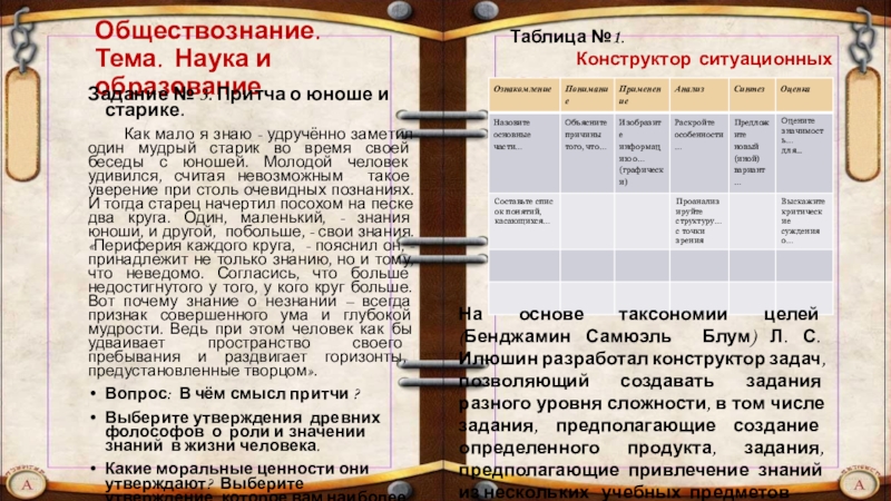 На основе таксономии целей (Бенджамин Самюэль Блум) Л. С. Илюшин разработал конструктор задач, позволяющий создавать задания разного уровня сложности, в том числе задания, предполагающие создание определенного продукта, задания, предполагающие привлечение знаний из нескольких учебных предметов