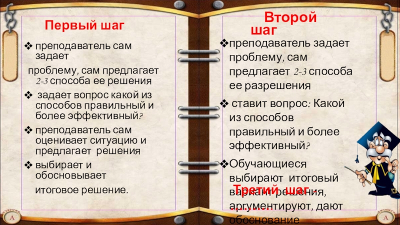 преподаватель задает проблему, сам предлагает 2-3 способа ее разрешения