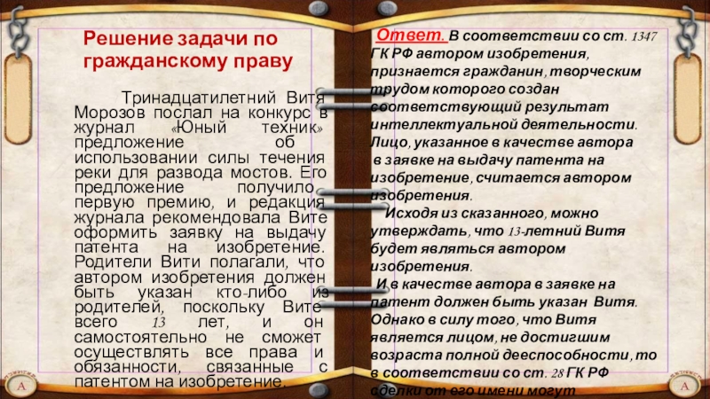 Исходя из сказанного, можно утверждать, что 13-летний Витя будет являться автором изобретения.