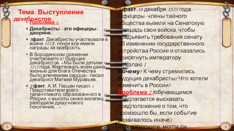 Проблема 2 (обучающимся предлагается высказать предположение о том, что произошло бы, если событие развивалось иначе): «Предположите, могли ли декабристы победить 14 декабря 1825 года? Как бы шло развитие России, если бы выступление декабристов закончилось победой?».