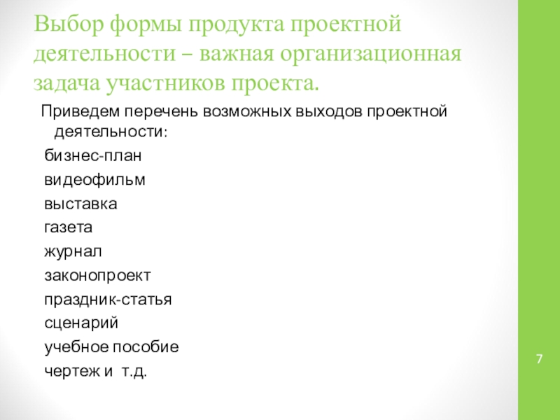 Слайд 7Выбор формы продукта проектной деятельности – важная организационная задача участников проекта.