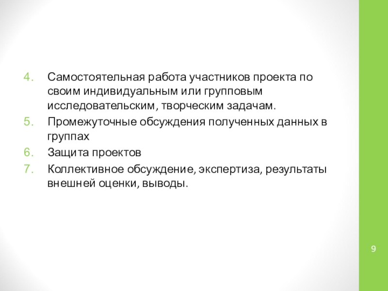 Слайд 9Самостоятельная работа участников проекта по своим индивидуальным или групповым исследовательским, творческим